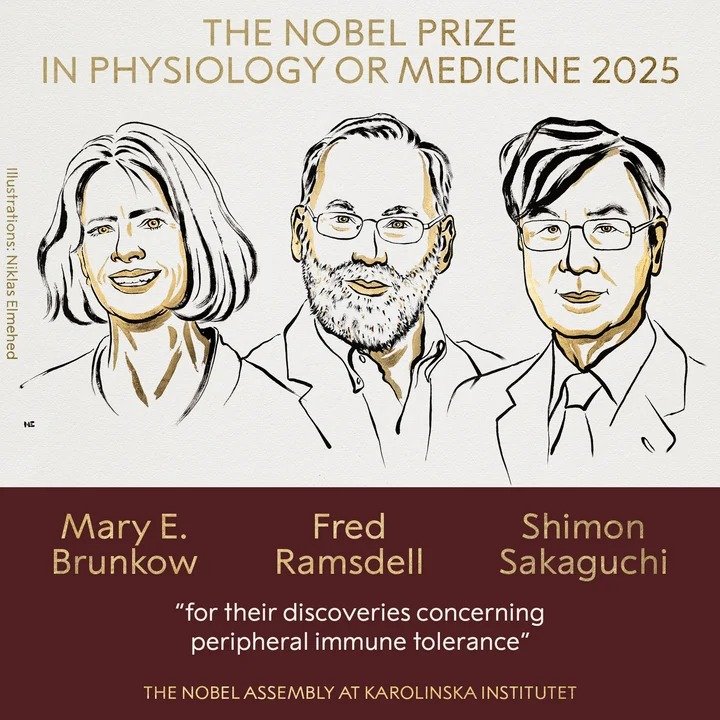 El Premio Nobel de Medicina o Fisiología de 2025 fue otorgado este lunes a Mary E. Brunkow, Fred Ramsdell y Shimon Sakaguchi "por sus descubrimientos sobre la tolerancia inmune periférica".
