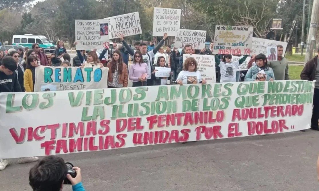 Con una imágen de la movilización anterior, que fue llevada adelante en julio de 2025, mostraron una gran bandera que señalaba: “Los viejos amores que no están, la ilusión de los que perdieron. Víctimas del fentanilo adulterado familias unidas por el dolor”.