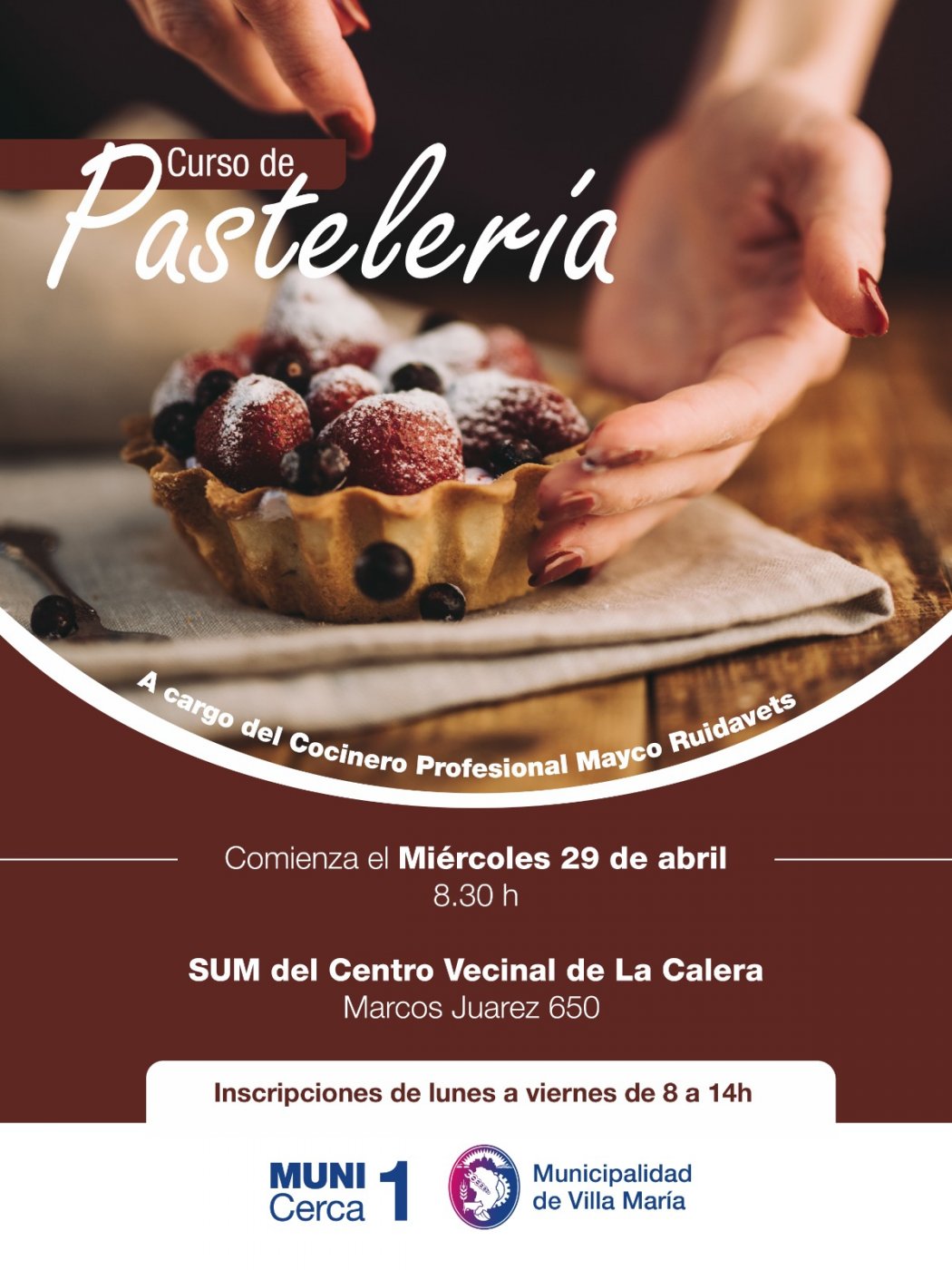 El dictado de clases estará a cargo del cocinero profesional Mayco Ruidavets y tendrá lugar en el Salón de Usos Múltiples (SUM) del Centro Vecinal de barrio La Calera, sito en calle Marcos Juárez 650. La jornada de apertura está programada para el miércoles 29 de abril a las 8:30 horas.