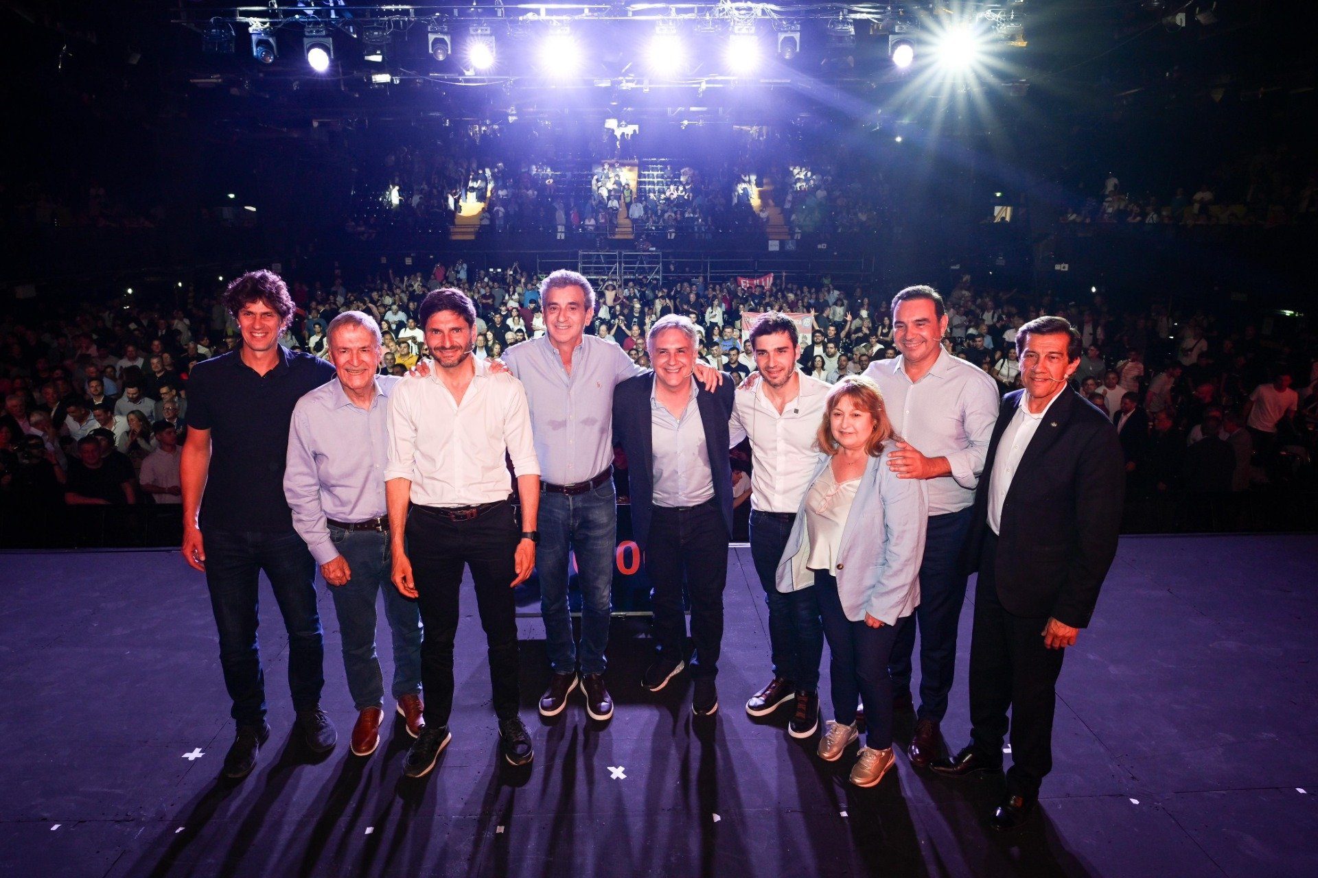 Del acto, realizado en el estadio Obras Sanitarias, participaron Maximiliano Pullaro (Santa Fe), Gustavo Valdés (Corrientes), Carlos Sadir (Jujuy), Ignacio Torres (Chubut) y Claudio Vidal (Santa Cruz) junto al exgobernador de Córdoba y candidato a diputado nacional, Juan Schiaretti.
