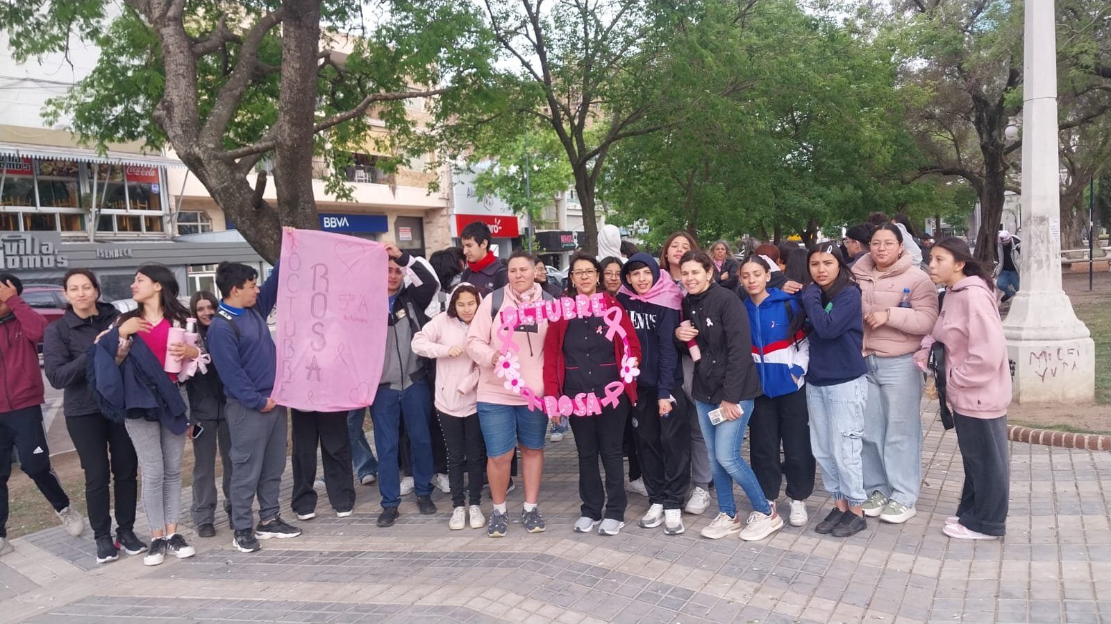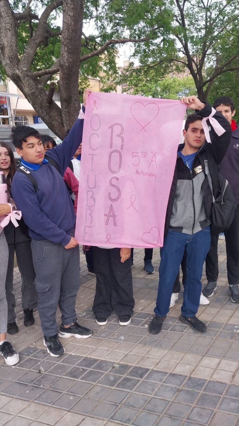 “Estamos haciendo una campaña de concientización con el cáncer de mama”, explicó la profesora Gabriela, una de las profesoras impulsoras de la actividad. La iniciativa incluyó una caminata desde el colegio hasta la plaza principal, donde los estudiantes recorrieron distintos comercios, la municipalidad y bancos. “Ingresamos por distintos negocios, municipalidad, bancos, que nos permitían pasar a dar lazos rosas y folletos concientizando sobre el cáncer de mama”, detalló.