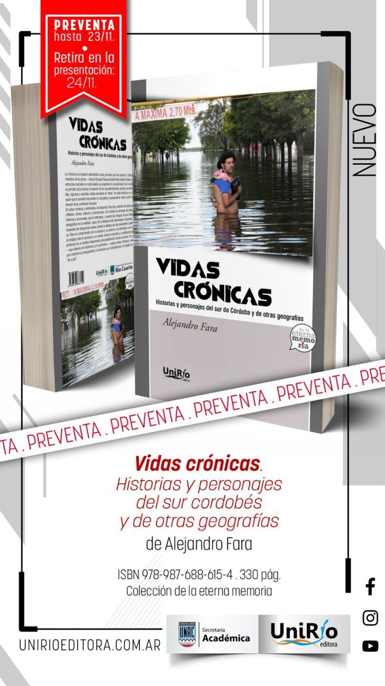 Vidas Crónicas, de Alejandro Fara. El reconocido periodista y profesor de la UNRC publica su primer libro. La presentación será el lunes 24 de noviembre, a las 17, acompañado por el escritor José Di Marco y el periodista Hernán Vaca Narvaja. Tendrá lugar en el salón auditorio de la Feria del Libro de Río Cuarto, ubicado en el edificio del Ex palacio de Justicia (Alvear 635).